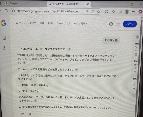 そんな感じで10数年振りにアクセス解析に触れてみて懐かしくなり、久しぶりにGoogleで「RYUBE大阪」を検索してみました。今はAI回答が最上位にくる設定のようです。そこに書かれている事を読んでみると・・・んん!?