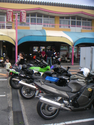 取り敢えず天理ICで待っているヤッシャー氏に合流しなくては。待ち合わせた5時45分に天理ICに到着すると、緑の忍者が停まっていた。挨拶もそこそこに、確認。「他のメンバーは通り過ぎませんでしたか?」 「いえ、10分程前にケロリンさんだけが通り過ぎて行きました」 「??」 今日は少なくとも私除いて参加者5台いるはずなのだが。私から送ったメールがちゃんとケロリンに届いているのか?それ以前にケロリンが第1集合場所に立ち寄っているかどうか、不安になった。躊躇していたら、見慣れたバイクが数台パスして行った。黒い隼、黒いZZR1400・・・。あれ、どちらも参加表明は無かったけれど。でもこれで本体がちゃんと香芝を出発したのは間違い無い。ヤッシャー氏と出発。最後尾のren氏@ZZR1400を追う。ところが・・・。桜峠への登り、あともう少しで追いつきそうなところで、ren氏@ZZR1400がペースアップ。後ろについた速いスクーターと一緒にかっ飛んでいってしまった。後ろからグワーンとヤッシャー氏のGPZ900Rが追い抜いていって、そのまま見えなくなった。・・・針を過ぎて道が落ち着いた頃、先程と打って変わってすっかり落ち着いたヤッシャー氏に合流(ヤッシャー氏は全開モードと落ち着きモードの差が激しい)。そのまま伊賀上野ドライブイン到着。