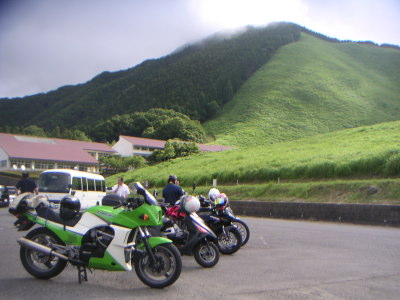 | ふと気がつくと、後ろに2台のバイクがついてきていた。1台は通りすがりのBMW。そしてもう1台は緑の忍者である。ここは素直に道を譲り、黒隼氏、BMW氏、ヤッシャー氏の順にかっ飛んでいくのに必死でついていく。ヤッシャー氏、背中が嬉しくて笑っている。いつの間にか黒隼氏もBMW氏もいなくなり、ヤッシャー氏と二人の世界に入っていた。・・・そして曽爾高原入口を3〜4kmも行き過ぎてしまった。 |