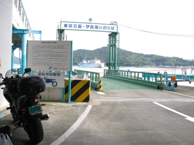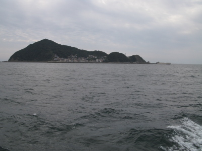 | 早速乗船でございますが、これがまたバカ高い・・・(汗)。いくら原油高騰の折と言えどもバイク+ライダーで4000円はなかろうぞ・・・。しかしながら、航海中は絶景でございます。30分ほどで「潮騒」で有名な「神島」の真横を通過・・・。 |