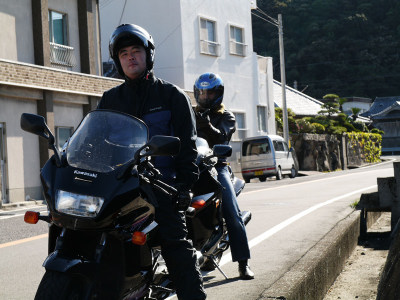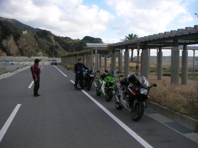 | 国道28号線はいつも通り交通量は多いが天気が良いので気持ちが良かった。2月に今年の初ツーリングをした時はこの辺りではみぞれのような雨に降られてブルブル震えながら走った。その時に比べればコンディションは雲泥の差である。 洲本を越えて、海沿いの県道76号線に入る。 今回は立川水仙郷(謎のパラダイス)はパス。あまりの寒さに?手招きババアはいなかった。 パラダイスを過ぎて15分程山道を走った後は、海岸沿いの快走直線路が待っている。 待っていましたとばかりにren氏@ZX−10とヤッシャー氏@GPZ900Rが先頭を走るT@GPZ1100を抜いていく。 ご機嫌なren氏(?)は尋常でないペースでぶっ飛ばしていく。 沼島に渡る港がある士生でようやく一休み。 津名からここまで約1時間。 |