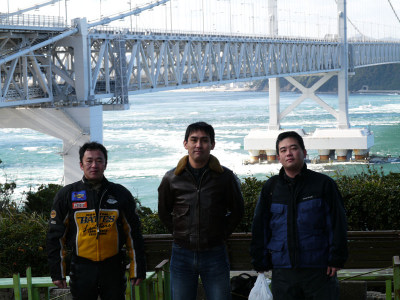 丁度潮の流れが一番早い時間帯だったのか、鳴門海峡は川のようだった。 (左からヤッシャー氏、私、T。撮影はren氏) |