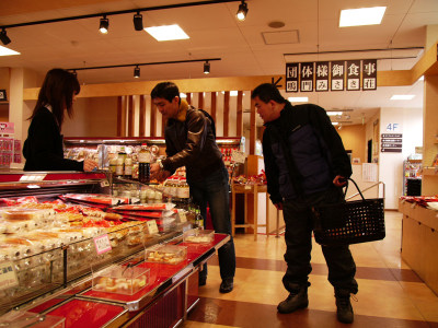 ここの道の駅の売店はお勧めである。 というのも大抵の土産が試食できるし、有名なオニオンスープは自由に飲めるようになっていて、広い店内を廻ったら淡路島の味を一通りつまみ食いができるという訳だ。 観光地の売店では私が知る限り、一番営業努力をしている店だと思う。 ちなみにこの日は食事はしなかったが、ここの食堂からは鳴門大橋が一望できて料理も結構美味しい。 (←ご機嫌につまみ食いをしているところをいつの間にかren氏に撮られてしまっていた。土産を見るTの真剣な目つき!ちょっと怪しげだが) |
