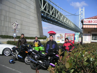| (カワサキ4兄弟。GPZ900Rから始まった水冷エンジンはZX−10を経てZX−11とGPZ1100へと使われてきた。写真は明石海峡大橋真下の道の駅「あわじ」。 左から私・ヤッシャー氏、T、ren氏) |