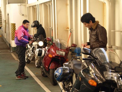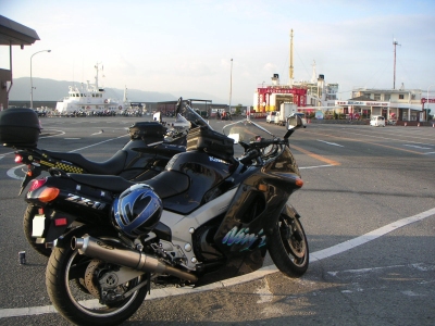 阪神高速若宮で降りて、そこから下道を走る。海岸線沿いの道は普段は常に渋滞しているのだが、朝は空いていて左手に淡路島と明石海峡大橋を眺めながらのクルージングは気持ちが良い。 たこフェリー乗り場には7時30分前に到着。フェリーの出発時間である8時25分まではまだ1時間近くある。それでもいつも早起き集合にも早いRip氏SRX600が到着していた。美味しそうにカップ麺を食べるRip氏。つられて私も食べてしまった。8時前までにははるさん、ビリケンさん、renさんが到着して全員集合。そしてここでTは娘のまつ神戸に向けて戻って行った。 |