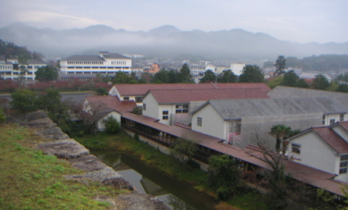 | 盛り上がらないまっすぐな道=ペースは速く・・・という事で篠山城には予定よりもだいぶ早い7時前に到着。早速篠山城に登ってみる。私は早朝のここからの景色が大好きだ。運が良ければ朝霧に包まれた篠山盆地を一望する事ができるらしい。そこまでいかなくても、朝霧がところどころ掛かり、静かで風情ある篠山市街地を眺めるだけで心癒される。三の丸東にある市立篠山小学校の建物は明治43年建立(ページ最終の写真)上から眺めるだけでも見応えがある。中も見学できないかなあ・・・。 他のメンバーはバイクを囲んでの談義。皆さんバイク本当に好きだ・・・。出発前の7時30分過ぎに、Rip氏と白隼氏(KNSK氏)が到着。 |