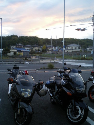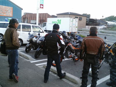 | 朝、あびこ大橋で丸さんと待合せし泉北1号線を使い集合場所の岸和田和泉IC近くのローソンへ向かう。集合場所には既にお久しぶりのうえぽん氏が到着していた。うえぽん氏は雨模様を睨んで車での参加である。予報に反して綺麗な空、そして次々登場するバイクを観て「バイクで来ればよかったかな・・・」とちょっと後悔の表情。 参加者は幹事のケロ、Rip氏、丸さん、うえぽん氏、ルーキー氏、JUN氏、ram氏、私の総勢8名。こんな短距離のツーリングによく集まって下さいました。7時過ぎとなって一向出発。 |