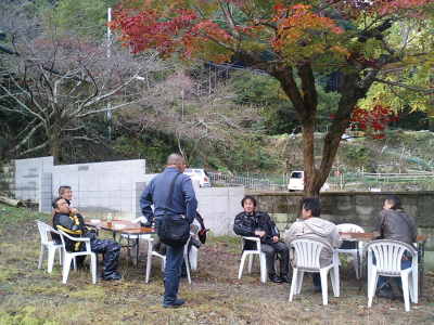 | 境内を出ると、おでんの屋台からうまそうな匂い。値段も1品100円と悪くない。思わず3品ほど購入すると、残りの参加者も続々と注文。裏にご丁寧に置かれていた休憩コーナーで暫し休憩。のんびりと空を眺めると綺麗な青空だ。「これやったら和歌山行けたかな・・・」ケロがぼそっとつぶやき少し残念そう。 | |