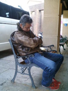 | いよやかの里駐車場に戻ってみると、一人ベンチで爆睡している丸さんを発見。朝の弱い丸さんだが今朝は珍しく待合せ時間にシャキッとした顔で現れたのだが・・・。普段の疲れか、でも気持ち良さそう。 |