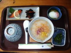 ここ「ほの字の里」の名物が「朝がゆセット」である。午前10時までの限定で、入浴と朝がゆがセットになって950円。大バーゲン価格である。朝がゆも本格的なものでボリューム満点。朝から温泉に入っておかゆさんを食べて・・・。言うことなしである。 ←朝がゆセット。おかゆさんはお茶碗2杯分強の分量がある。 |