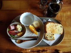 400円の自家焙煎コーヒーをいただくつもりで立ち寄ったのだが、100円差でモーニングセットがあったため、こちらを頼むことにした。ミミオは2回目の朝食、Mr.Tは3回目の朝食である。自家製パン、サラダ、ヨーグルト、フルーツ、コーヒーとついて500円。こちらも大バーゲン価格である。ちなみに自家製パンは何通りか種類があって、選択できるようになっている。この日は休日限定の「山ぶどうパン」を選択した。 ←喜楽歩のモーニングセット。毎週でも通いたいくらい。 |