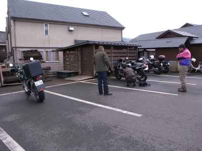R309〜R170〜R371〜京奈和道〜R24を通り、1時間ほどで蔵の湯へ・・・。すでにはるさんが到着。なんと、はるさんのバイクがXJR1300に化けておりました(驚)。皆さんお好きでございます(笑)。 ここでトラブル発生。前回のRYUBEツーに引き続き、黒隼氏のバイクがおもらしをしております(画像はご本人の意向により自主規制)。前回の修理キットをそのまま搭載しているとのことで、応急処置開始。そうこうしていると、昨年末の笠置カブキチツーリングでお世話になったJUNさんが、キャンパー仕様のバンバン改に乗って登場!(笑)寒い中、遠路はるばるご苦労様でございます |