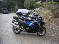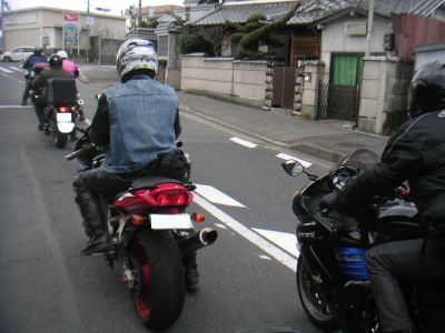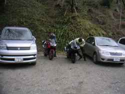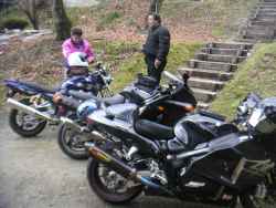 マッハVには、私ケロリンとミミオが集合予定でございます。2人でモーニングを食っていると、聞きなれた爆音が・・・(笑)。黒隼氏でございます。聞くところによると、黒隼氏も久方ぶりのバイクだそうでございます。朝9時、第2集合の蔵の湯に向けて出発でございます。 |