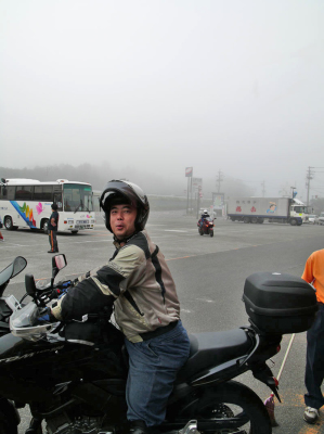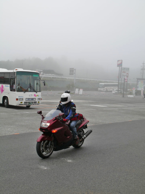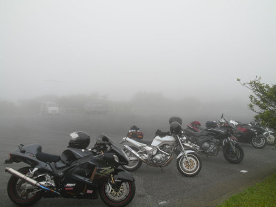 伊賀上野ドライブインを出発し、上野東ICを降りて、国道422号〜国道165号を使って最初の目的地、青山高原を目指す。 8時過ぎに青山高原道路に到着。 さあこれから高原ワインディングを堪能だ!と張り切ったのだが直前から霧が立ち込めて視界不良。 ここまで先頭を走ってきたのだが、結構なタイトコーナーでいっぱいいっぱい。後ろから元気なかっ飛びおじさんライダー2名、ren氏と富吉氏がせまってきたので道を譲ると、2台は霧の中あっという間に先に消えていった。 更にしばらく走っていると、今度は黒隼氏とRip氏の重量・軽量コンビが追いついてきた。 これも素直に先に行って貰う。 皆速いなあ! 1人で走っても面白くないのでなんとか重量・軽量コンビについていき、いよいよ霧で何も見えなくなった駐車場に到着。 ここ、天気が良ければ眺めは良いらしい。 が、この日は何も見えず。