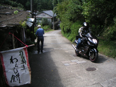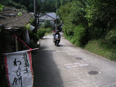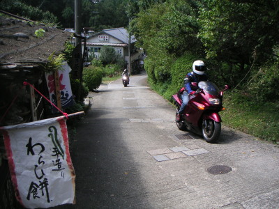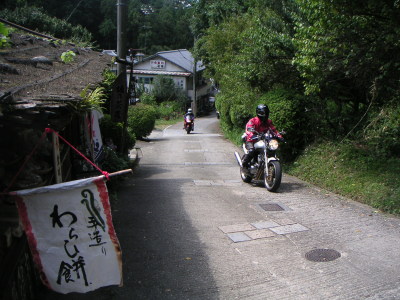 道の駅「大宇陀」を出発。途中の信号で私だけはぐれてしまう。 ここから明日香村までは交通量多く急いでも仕方が無いのでトコトコ走る事にする。 土日バイク禁止区間を気がついたら通ってしまったようで、「坂の茶屋」到着した時は先に走っていった集団はまだ到着していなかった。 またしても”うさぎとかめ”。 もっとも私の場合は反則走行だったようだが(でも、看板出てなかったからなあ・・・) 暫くして爆音とともに5台が到着。 そうめんを食べながらのんびり1時間半ほどまったりする。