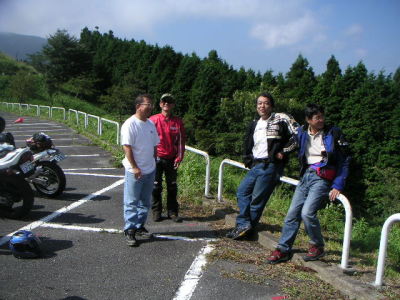 後からはるさんとTも到着。 景色を眺めようがないので、かねてから企んでいたTの新車TDM900を試乗させて貰う事にする。 丁度先頭を走っていた元気なおじさんライダー2名は駐車場よりも更に上に登っていったようだったので、その探索も兼ねてそちらに向かう。 確かにTの言うようにエンジンはちょっと気難しい。 昔九州の銀だこ氏が乗っているTRX850に乗せて貰った事があるが、よく似ている。 でもハンドリングは軽快だ。やたら高い位置のハンドルも慣れれば問題はなさそう。 このバイク、乗りこなすには慣れが必要だろうが、潜在的なポテンシャルはかなり高いと感じた。 ほどなく道をおりてくる冨吉氏とren氏を発見。 |
