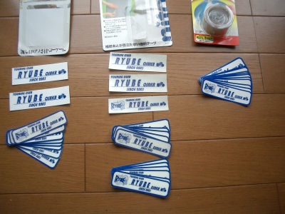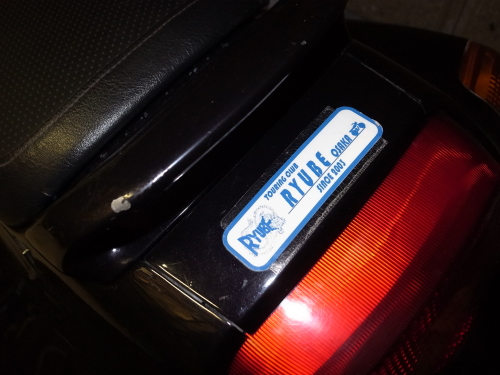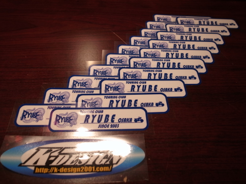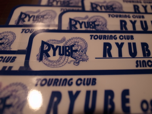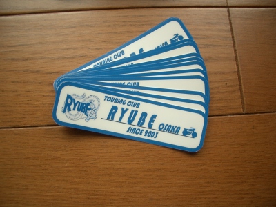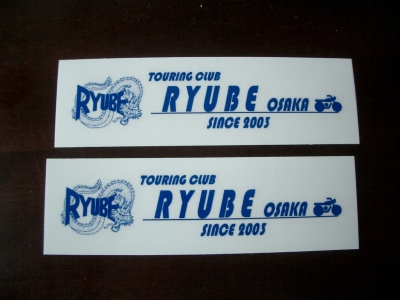 平成18年忘年会の席で、メンバーから「RYUBE大阪のステッカーを作ろう!」という希望が挙がりました。 早速ステッカー製作会社に問合せ。ところがデザインから外注すると結構なお値段、ハードルの高さに計画頓挫していました。そこにうえぽん氏から”ステッカー試作”の連絡。「せせらぎ街道ツーリング」で現物を見せて貰うと、耐水シートに透明シートをかぶせた本格的な造り。これならば耐久性も高そう、という事で「RYUBE大阪 ステッカー製作委員会」を立ち上げ、うえぽん氏を委員長に任命!。メンバーの意見を取り入れ、平成19年末「公式ステッカー」が無事完成。うえぽん委員長の御厚意でメンバー全員に無償で配られました。以下は当時の作成経緯です。