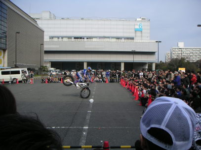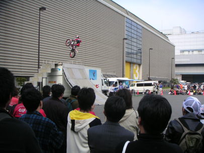 バイクも観て、コンパニオンのお姉さんも観て、カメラ小僧の生態も観察して、2時間半充分に会場を堪能したので、帰路につく事にした。外に出て帰ろうとすると、2号館の裏手に人だかりができていた。 観に行ってみると、マウンテンバイクのトライアルデモンストレーションをやっていた。 日本選手権で上位入賞をしているという三谷英明氏と小川友幸氏の2名が派手なパフォーマンスを行っていたのだが、司会の女の子(多分その子もマウンテンバイクの選手)が上手な事もあった、とても盛り上っていた。 それにしてもバイクでよくあれ程のパフォーマンスができるものだ。二人共感心してしばし観てから、家路についた。