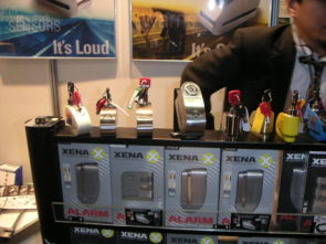 メーカーのブースをひと通り観た後には、小ブースを観て回った。 興味を引いたのは、XENAブランドで知られている警報器付きディスクロックのメーカーである(有)エーアンドエーのブースである。 新しいモデルの展示をしていたのだが、警報器のデモンストレーションをしていた。特にロックを水槽に沈めて水密性をアピールしていたのには好感が持てた。 警報器付きロックでは耐久性や防水性が本当に確保されているのかが気になるところだが、こうしたデモンストレーションをモーターサイクルショーでやる事は、製品の品質をアピールする上でとても有効であろう。