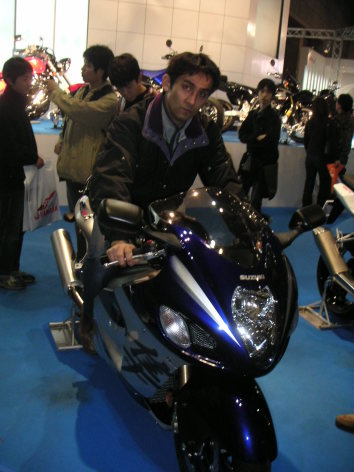 (スズキブースで隼に跨ってみる。ZX−11よりはポジションはきつかった。