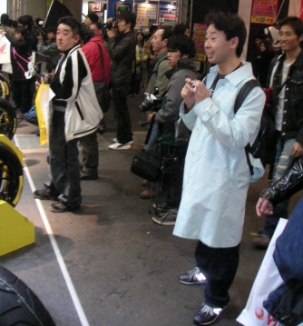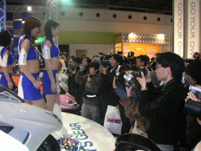 ブースをひと通り廻ってみて、もうひとつ興味の湧いた事がある。 カメラ小僧の生態である。 あまりこうしたショーを観に来る事がないので、お目にかかる機会が無かったのだが、ライダーに負けない位の数のカメラ小僧がいるのには驚きだった。 もっとも、コンパニオンの色気には思わず私とTも一時彼らの仲間入りをしたのだが、本物の彼らの執念は凄いものがあった。 女の子に群がってひたすらシャッターを押し続ける姿は大変興味深く、ひと通り会場を観て廻った後は、私は彼らの生態を観察するようになった。 途中、明らかにパンチラを狙ってローアングルから撮影していたカメラ小僧が係員から注意をされていのだが、注意されても怯まない彼らのバイタリティはある意味凄いものがあった。