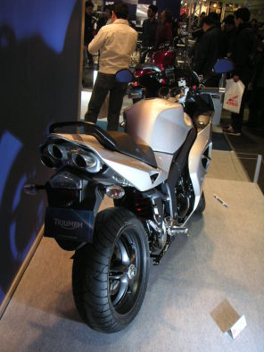 トライアンフのブースは海外メーカーの中では派手な演出も無く、それ程目立っていなかったのだが、ひとつ1000ccの3気筒エンジンを積んでいるスプリントSTには興味を引かれた。 とてもオーソドックスなデザインだが、ツアラーとしては使い勝手が良さそうだ。なんといってもテールの3本の排気管が面白い。 どんな乗り心地なのか、興味がある。 跨る事ができないのが残念であった。