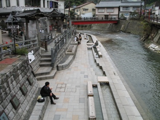 川沿いに足湯が出来ておりました。昔は無かったよなぁ〜。恋人同士仲良くベンチに座って語らう姿を見て、さて?この二人は続くかなぁ〜なんて親父は想像するわけでございます♪しかし下のこの男、一人でパンをかじる姿、悲哀を感じます。