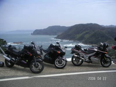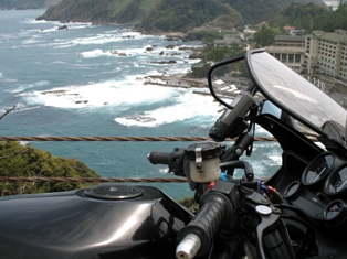 久しぶりにワイディングを楽しみました♪昔、但馬海岸道路として有料道路でしたが、今は無料(^^ タイトコーナーの連続です。寄る歳波か・・、久しぶりのワイディング思ったようにラインが取れません・・。うーん練習せねば、リハビリしてるような感じでいい汗かきました。ここで、ZX-11とGPZ1100を運転させて頂き違いを体験、エンジンは排気量から低速のトルクを厚めに感じました!重心位置も低め、ちょいとZX-10のハンドリングと異なり、高速安定性へ大きく振っているなぁと感じました。試乗させて頂き有難うございました♪参考になりました、同じ兄弟車でも味付け全然違いますね〜。エンジンに至っては私のに比べるとホンダ車みたい(笑)昔日和山公園、今は城之崎マリンワールドを見下ろしながら本日二つ目の温泉城之崎へ向かいます。