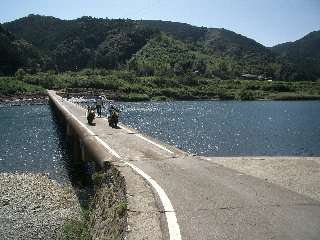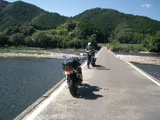 その県道がまた狭路でおまけにすぐ下は崖、落ちたら四万十川に吸い込まれます。ここを前から多くの車がやってきますからとても走りにくい。佐田の集落からは道幅も1車線はある道路になりました。まず、佐田の沈下橋、っていっても沈下橋をみるのは始めて、欄干がなく道路だけの橋は渡っていて落ちそうですね。このままバイクで落ちたらどうなるかな?なんて考えたら・・・怖っ!しかし、有名なのか観光客が多いな。