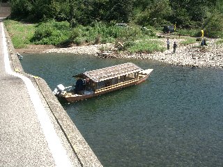 このあたりはまだ下流で川幅も広いので橋の長さも長く渡り応えがあります。この沈下橋のすぐ脇から屋形船がでています。船頭さんが櫂でこぐんでしょうけど、船外機も付いてます・・・