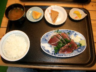 メニューはかつおだけ。たたきの定食か丼か、かつおの刺身か、これだけ。やっぱりたたきが食べたかったので「かつおたたき定食」を注文しました。待つこと10分ほど、来ました来ました。
