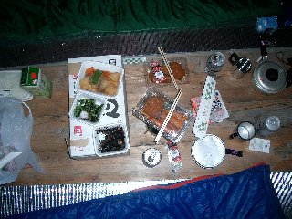 自然と共に暮らす朝は早いっ?それは違いますっ!(キッパリ)昨夜、寝る前に携帯のアラームを6時にセットしたのは覚えています。今何時かな?げっ、7時前やんかっ!寝過ごした、寝過ごした。しかし空は快晴っ!最高の天気だねっ!昨日の買い物で朝食用にと買っておいたカップラーメンを食べる。この山の中、朝はかなり冷え込むためこのラーメンは正解だった。体も温まったところで、出発準備、その前に他のグループの方々は早々に出発している。結局、我々が一番最後、8時過ぎの出発となってしまいました。