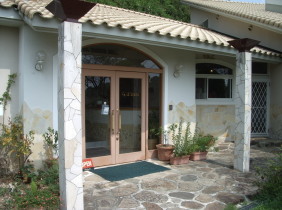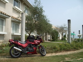 「オリーブ園」を早々に後にして、バイクを牛窓の中心部からやや東の高台へと転がした。しばらく走るとギリシャ風のきれいなペンションが見えてきた。ここでモーニングコーヒーにしようとバイクを止め、中を覗くとどこかMr.T風のいかつい親父さんが1人いる。どうもとっつきにくそうだったので入るのを辞め、別の店を探そうと思ったら親父さんが「何か御用ですか?」と岡山弁丸出しで声をかけてきた。声をかけていただいたからには入らないわけにはいかず、中へ・・・。ダイニングに通されると朝食中の女性が3人。「あんたら何しに来たん?私らのバカンス邪魔せんといて!」と言わんばかりの視線が痛かった。それもそのはず、汗まみれで髪の毛ぺったんこの三十路の野郎が2人のそのそと入ってきたのだからそう思われても仕方がないだろう。 |