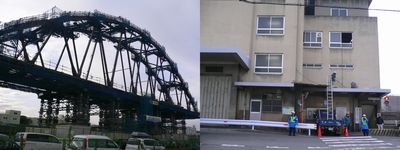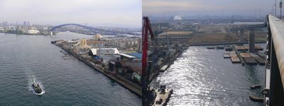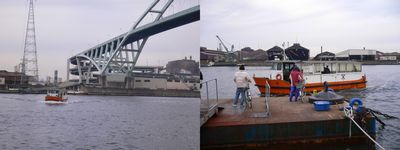 店先のイスに座ってホルモンを堪能した後は、腹ごなしの「坂登り」。「なみはや大橋」を渡って再び大正区へ戻ります。「なみはや大橋」は数年前に開通した有料橋で、全長1700メートル、ピーク部は水面高45メートルを誇る巨大橋でございます。平均斜度は約7度、850メートルずつ登り下りがございます。