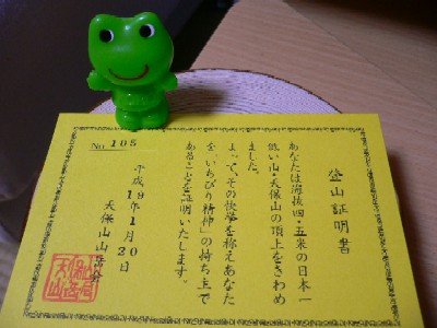 「あなたは海抜四・五米の日本一低い山・天保山の頂上をきわめました。よって、その快挙を称えあなたを「いちびり精神」の持ち主であることを証明いたします」と記されております。