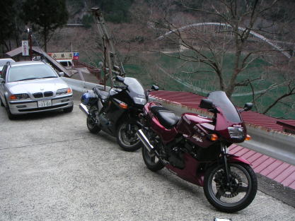 明日香村を通り、大宇陀に回りこんで370号線を南下する。 途中、鼻かみ休憩に寄った「道の駅 大宇陀」ではGSX1100やVTR1000を跨ったツーリングクラブと一緒になる。彼らとはこの先の 「道の駅 杉の湯川上」でも一緒になる。 春になってツーリング族も活動再開しているようだ。 370号線からは信号の無い道になる。 細かいカーブが続く370号線はTが先頭を走り、169号線の「道の駅 杉の湯川上」を越えてからの久しぶりの高速ワインディングは私が先頭に立ってハイペースで飛ばした。 信号が無く、リズムを取りながら走り抜けてゆく、久しぶりの感触がとても楽しかった。相変わらず寒かったが、この区間はそれも忘れるほど集中して走る事ができた。 入之波温泉には予定通り9時45分に到着した。