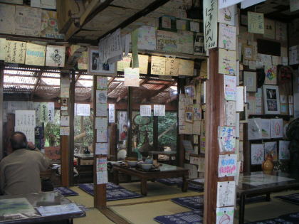 入之波温泉を10時半に出発。もと来た169号線を引き返し北上する。 帰りは下り、かつ交通量も増えていたので2人とも自重する。 吉野町経由で明日香村の坂乃茶屋には11時40分頃に到着した。久しぶりのおばあちゃんの笑顔。 この日は大学生になり、すっかりお姉さんになったお孫さんも手伝いに来ていて、花粉と風邪で咳をしていたら、喉アメを持ってきてくれた。 こういった心遣いが全国に多くの坂乃茶屋ファンを生むのだろう。 ちなみに、その代表が相棒のTである。 ここの魅力にすっかり虜になったTは、店の人から依頼されてもいないのに、わざわざ自分のHPと別にアドレスを取得して「坂乃茶屋ファン倶楽部」なるHPを作ってしまったし、自分の娘の名前もこの地方にゆかりのある名前をつけてしまった。根っからの明日香村好き、坂乃茶屋好きである。 そして、私もT程では無いけれど、明日香村の雰囲気と、坂乃茶屋の温かさが大好きである。 いつもの坂乃茶屋定食を食べて、一息つき出発したのは12時40分だった。