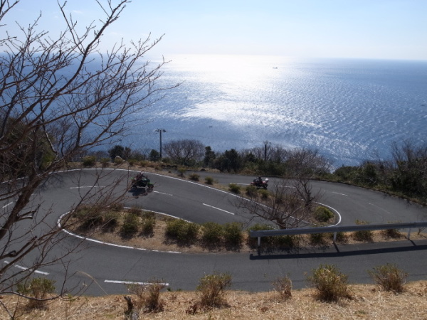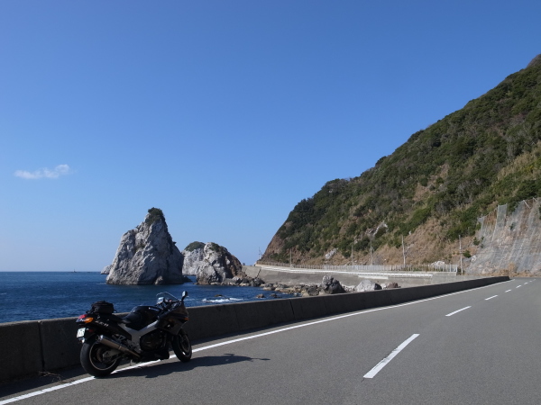 御坊IC降りたコンビニでうえぽん氏と合流。「知らない人が沢山いる・・・」とビックリしたご様子。ケロ同様昨年仕事が忙しくなりバイクに乗る時間が限られたとの事。RYUBEのツーリングは1年ぶり。古参メンバー同士御一緒できるのは嬉しい限りだ。御坊ICから市内を抜けて、久しぶりの美浜町・煙樹海岸を走る。この頃には日の昇って暖かくなり、海を見ながらの走行は気分爽快だ。日ノ御碕には11時20分到着。