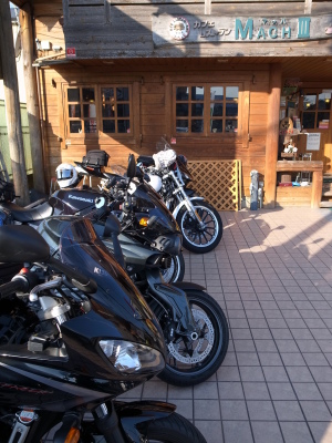 | 第1集合場所はマッハV。開店と同時、バラバラという音とともに数台バイクが到着。ケロ@アネーロ、ルーキー氏@CBR、ルーキー奥様@ハーレー、黒テン氏@FZ6、ひめやん氏@K1300、少し遅れて黒隼氏@隼。総勢7台。 黒テン氏とは以前どこかでお会いしたかな?お名前はよくお聞きしていたが。お初のひめやん氏と3人、すぐ近所に住んでいる事が判明。今後も宜しくお願いします。ルーキー氏はともかくルーキー奥様この寒い中根性座っている(笑)。もっともハンドルカバーに電熱ウェアと装備にぬかりない。黒隼氏は直前まで参加を迷っていたらしい。この時期この気温、無理もない。そしてケロ企画部長。てっきりバイクは足を洗ったのかと思っていたが・・・。数日前に自転車で転倒したそうだ。「やはりバイクから縁遠くなったか」と思っていたが意地を張っての参加となった。第2集合場所に直接行くメンバーが増えた為、マッハV滞在を短くして出発。 |