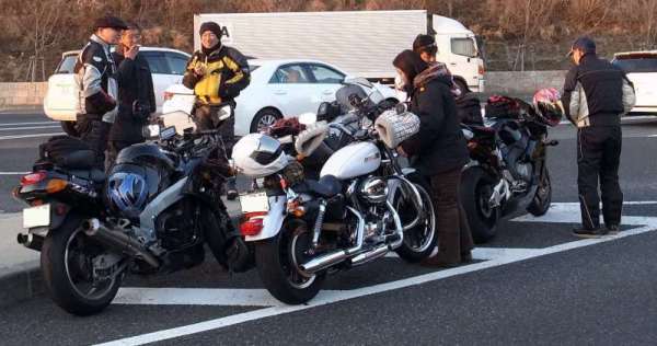 紀ノ川SAでは、海南高原手前で離脱したマッチン氏が待っていてくれた。暫く待って本隊も到着。ルーキー奥様にトラブルがあったとの情報が入り心配したが、無事到着されて一安心。解散前の一時、Rip氏タバコ美味そうですな。本日のツーリングはここで解散。寒い中御一緒頂いた皆様、ありがとうございました。次回は3月、寒さの懸念はあるものの長距離走る予定にしています。