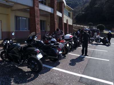 紀ノ川SAで合流したのが、マッチン氏@CB、はるさん@XJR、Rip氏@MT-01、うぞうむぞう氏@ZX-12R、RAM氏@9R、ブラ氏@ST1300、KNSK氏@R6の7台。皆さんきちんと重装備、それにしても総勢15台とはビックリ。RYUBE大阪史上最大数かもしれない。この寒い中皆さん物好きな(笑)。当初は3〜4台集まれば嬉しいな、と思っていた。幹事の立場から言うと、集まりそうな時は集まらず、集まりそうにない時に沢山集まる。全く参加人数の予測ができない不思議なクラブである。でも実は例年始動ツーリングが一番参加人数が多くなる。何しろこの寒さ、何もなくてバイクを動かそうという人は稀だ。企画があれば「頑張って動かしておこう」と思うもの。