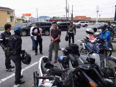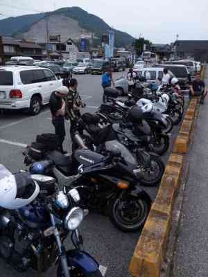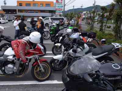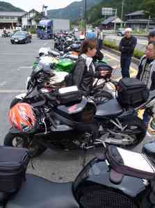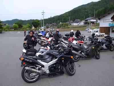 ゆうさんは参加表明のメールを打って送信し忘れた(笑)そうで、駐車場に戻ったら普通に話をしていてびっくり、BMW氏と二人去年の丹後半島以来。イケちゃん氏となべちゃん氏はren氏行きつけのJ-WORKSチーム。緑のGPZが渋い、周山は朝の散歩道なのだとか。名田庄まで御一緒頂いた。じゅうよんあーる氏とまさっち氏は今回初参加。まさっち氏と姫やん氏が何と顔見知りである事が美山町に来て判明したらしい。凄い偶然だ。 |