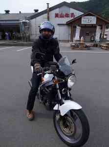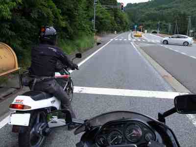 県道19号を抜け、ワインディングになったところでアネーロのペースがあがる。車をパスするタイミングで離れた後なかなか追いつけない。250ccの排気量はともかく、あのブロックタイヤでようやるわ。西角交差点左折箇所でカメラを構える御仁あり。美山町から合流予定のren氏だ。”加齢”コーナリングを写真に撮って貰った(→renkonツーリング)。道の駅みやまには予定より早く7時半到着。