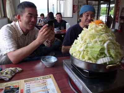 「びわこ食堂」のとりやさいなべ。これで4人前。野菜が活火山のように山盛りで圧巻。これに拘った企画部長の嬉しそうな顔。 ルーキー夫婦とゆうさん・BMW氏のテーブルでは女性同士楽しそうに会話が盛り上がっている。ゆうさんとルーキー奥様、同じ女性ライダー(しかもお二人とも速い)ならではの会話?。 |