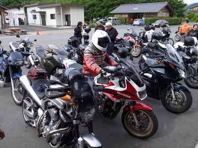 さて今回のツーリング、珍しく告知直後から参加表明が続々届き前日段階で何と15名。更にケロ曰くこの先もう何台か合流があるかも、との事。梅雨時期のツーリングには非常に珍しい。久しぶりの企画部長企画、変なネーミングの効果とは思いたくないが集客力は抜群のようだ。但しこれだけ大人数では収拾がつかなくなる可能性もある。前日のHPで「大人数ツーリングになりそうです。普段以上にバラける事必須、参加予定者は休憩ポイント、参加・離脱タイミング(自由に設定下さい)の確認を宜しくお願いします。」と告知し、更に出発直前には 「大人数では危険なので、バラけて下さい」 とお願いした。次の目的地は美山町。