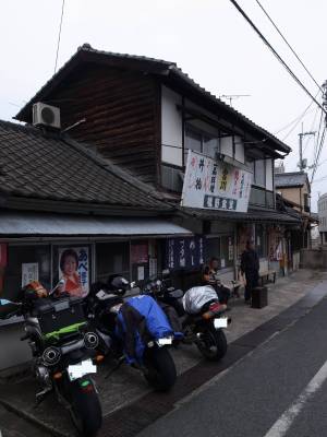 残った大阪メンバー、Rip氏、黒隼氏、ブラ氏、はるさんの5名で協議。天気が良ければ吹屋まで廻ったりしようかとも思っていたが、小雨がパラパラきていたので多数決で津山ほるもんうどんを食べて帰る事になった。当初からめぼしつけていた「橋野食堂」をナビに入力して地図を表示して黒隼氏がビックリ「ここ、俺の親戚ん家近くやわ」 急遽黒隼氏の里帰りも目的に兼ねて一路高速で津山ICを目指す。前日の疲れか普段は楽しい高速走行もかなりきつい・・・。