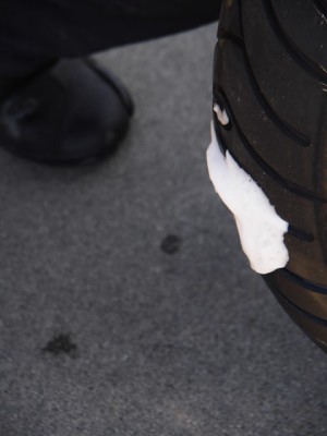黒隼さん大好きな泡で点検、最初わかりませんでしたよね・・・見た目の亀裂よりタイヤの被害は少なかったかと。renkonサイクル(有) パンク修理完了。そういえば・・・以前の郡上八幡ツーリングで黒隼さん、節子の呪いで、ラジエターお漏らし・・・まだ呪いは続くのでしょうか?(汗)修理は近くのガソリンスタンドで、空気入れながら、関ヶ原の駅に戻ると・・・