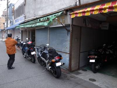 | 期待にたがわずユニークなお店、古い商店街の一角がバイク屋になっている。 ケロの虫明で調達した牡蠣をおすそ分けのお返しに、店主から何故か”激辛カップ麺”を私まで頂いた。しかし辛いのが大の苦手な私が、「激辛好き3人が誰も食べられなかった(店主)」、ものを食べれるのだろうか・・・。 |