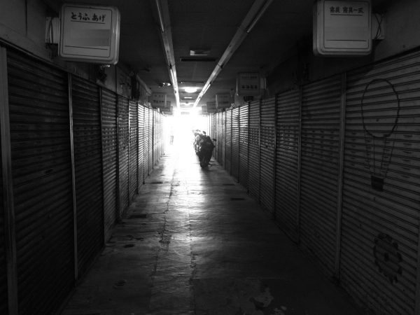奥に入ってみる。昭和の旧き良き雰囲気、すべての店にシャッターが下りていて商店街”跡”なのが残念だが、これはこれでいい味を出している。