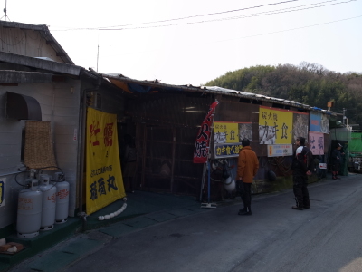 | 今回の参加者6名が全員集合したところで、ケロ幹事を先頭に虫明集落を走る。10分程で今回の目的地「稲荷丸」に到着。 |